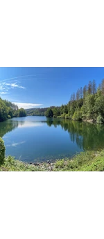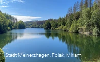 Wir starten unsere Wanderung beim Wanderparkplatz am Eingangsportal zum Fernwanderweg Sauerland-Höhenflug (Schallershaus) in Meinerzhagen und wandern in Richtung Meinhardusschanzen-Skisprunganlage. Wenige Meter davon entfernt entspringt die Agger, die nach 69 km zwischen Siegburg und Troisdorf in die Sieg mündet. Für ca. 500 m folgen wir dem Sauerland-Höhenflug (weißes H auf gelbem Grund) und verlassen diesen dann nach rechts. Es geht leicht bergab, man quert nochmal den Sauerland-Höhenflug und trifft so auf einen breiteren Weg. Hier biegt man nach rechts und 300 m weiter erneut nach rechts ab. Wieder gelangen wir auf den Sauerland-Höhenflug-Wanderweg, auf dem wir nun entlang des plätschernden Bachlaufs zum Schloss Badinghagen weiterwandern. Das romantische Fachwerk-Wasserschloss, das 1160 zum ersten Mal urkundlich erwähnt wurde, wird heute privat genutzt und kann daher auch nur von außen besichtigt werden. Anschließend biegen wir nach rechts ab und wenden uns bei nächster Gelegenheit nach links. Wir wandern nun rechtsseitig an dem großen Teich entlang und gehen ein kurzes Stück neben der L323. Dann quert man die Straße und läuft auf dem leicht ansteigenden Weg weiter, bis man auf den breiten Erlenweg trifft. Diesem folgen wir 200 m nach links und gehen dann auf einem schmalen Pfad weiter, von wo aus wir herrliche Blicke über Wiesen und Wälder bis in das Aggertal hinein genießen können. Kurz vor der Ortschaft Helberg treffen wir wieder auf den Erlenweg und biegen von diesem nach rechts in Richtung Nordwesten ab. Durch abwechslungsreiche Waldabschnitte geht es nun bergauf zur Schutzhütte am Harkenstiel. Hier hat man ungefähr die Hälfte der Wanderung geschafft und kann sich an der Hütte eine gemütliche Rast gönnen. Dann gehen wir durch malerischen Buchenhochwald bergab und folgen dem Dreslerweg nach links. 200 m weiter biegt man nach rechts ab und kann nun schon linker Hand die Wasserfläche der Genkeltalsperre sehen. Das Gewässer ist eine reine Trinkwassertalsperre, die hauptsächlich von den Flüssen Genkel und Grotmicke gespeist wird. Wir wandern entlang der Talsperre weiter und folgen dem Linksknick des Wegs. Dann biegt man drei Mal nach rechts ab und lässt so allmählich die Genkeltalsperre hinter sich. Vorbei an saftigen Weiden folgen wir dem Weg ins Tal der Grotmicke. An der Pegelstation hält man sich links und geht entlang des Bachlaufs und durch Wiesen weiter in Richtung Heed. In dem kleinen Ortsteil von Meinerzhagen befindet sich das Gästehaus Heed. Das wald- und umweltpädagogische Zentrum ist ein ehemaliges Naturfreundehaus, das 36 Betten beherbergt und auch als Tagungs- und Seminarstätte dient. Zudem kann man hier an Sonn- und Feiertagen zwischen 14 und 16 Uhr und nach Vereinbarung selbstgebackenen Kuchen und Kaffee kosten. Nachdem wir uns gestärkt haben, wandern wir weiter und halten uns links. Man überquert die L323, geht ein kurzes Stück rechtsseitig entlang der Landstraße und wendet sich an der folgenden Weggabelung nach rechts. Wir folgen dem Weg aus dem Wald heraus und können rechter Hand bald auch wieder die Meinhardusschanzen sehen. Am Schützenplatz biegt man nach rechts ab und geht ein kurzes Stück entlang der L306n weiter, die zurück zum Ausgangspunkt führt.